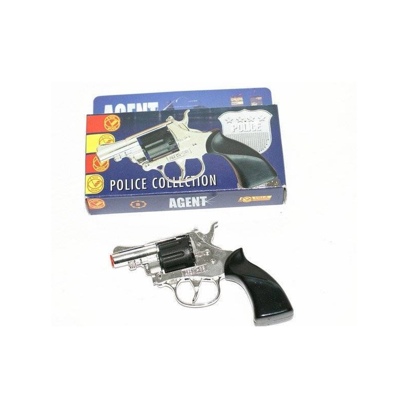Pistola giocattolo in metallo modello agent 38 di colore argento 8 colpi 125 dB a tamburo Fabbricata completamente in Italia Confezione in scatola a vetrina litografata