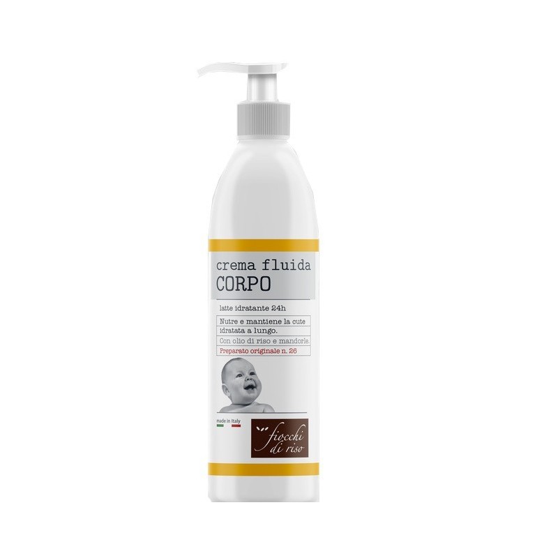 Fiocchi di riso crema fluida corpo Crema fluida CORPO di Fiocchi di Riso è un latte idratante a lunga durata 24h indicato per la pelle sensibile di neonati e bambini da utilizzare dopo ogni bagnet