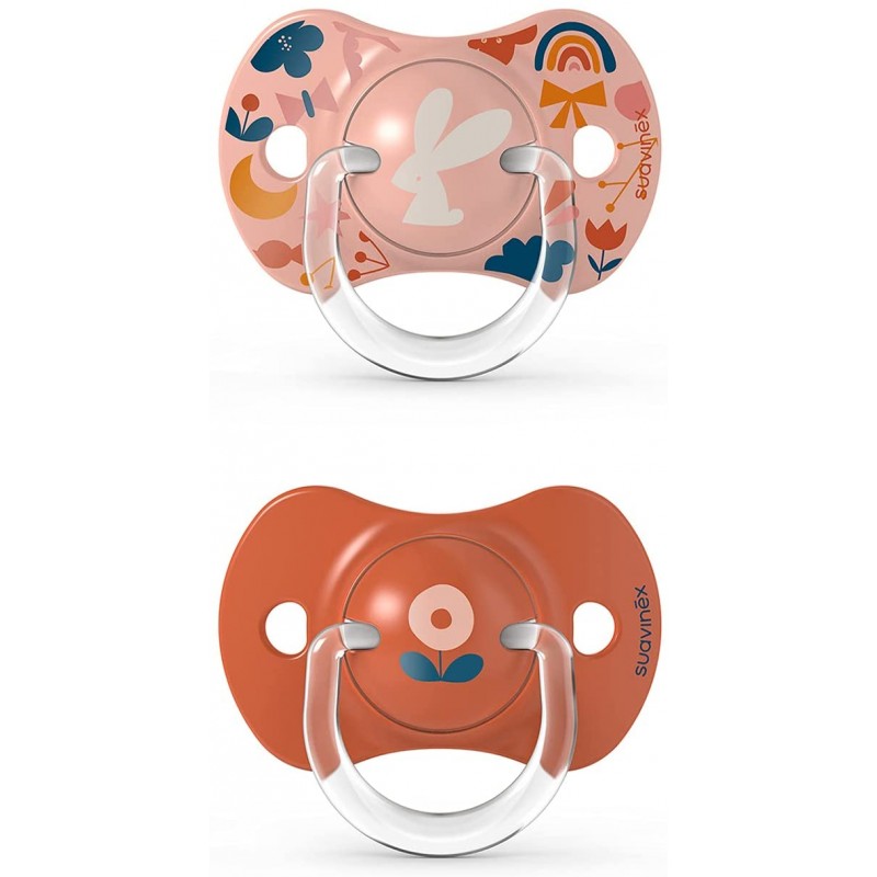 Suavinex 2 Succhietti con Tettarella Reversibile SX Pro 18 Mesi e Modello Flower e Rabbit ocra sono bellissimi succhietti reversibili in silicone progettati per non invadere il cavo orale e per