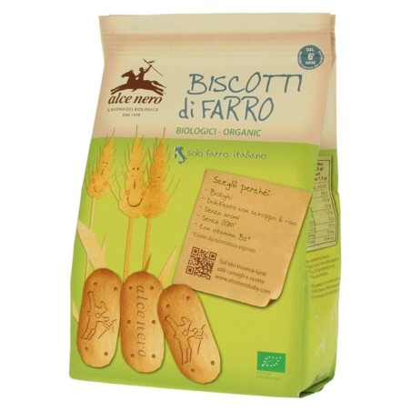 I biscotti di farro Alce Nero sono prodotti con farro italiano che si contraddistingue per il sapore dolce e il suo stelo lungo Questi biscotti non contengono olio di palma e sono dolcificati con succo di mela e sciroppo di riso La produzione avviene in uno stabilimento certificato ai sensi della normativa in materia di produzione di alimenti per l infanzia