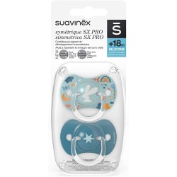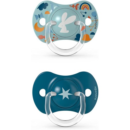 Suavinex 2 Succhietti con Tettarella Reversibile SX Pro 18 Mesi e Modello Star e Coniglio Blu sono bellissimi succhietti reversibili in silicone progettati per non invadere il cavo orale e per dare al bambino la stessa sensazione che si trova nel suo stato naturale anatomico quando lo fa non avere un succhietto