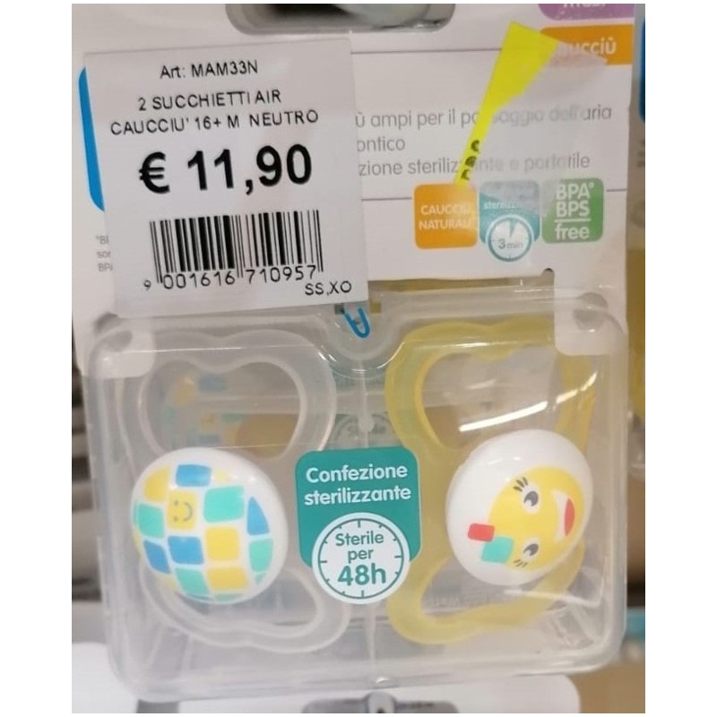 MAM Air Succhietto Caucciù Indicazioni Generali Succhietto in caucciù Filosofia Il brand MAM è leader nel mondo nella produzione di prodotti per la puericultura I prodotti per bambini sono soggetti in tutto il mondo ai più alti standard di qualità e sicurezza Molti di questi sono stati anticipati da MAM tramite lo sviluppo proprio dell azienda vengono prodotti solo articoli che hanno ottenuto l approvazione di esperti di medicina e di scienza all interno della rete MAM Specifiche prodotto Mam Air ha una mascherina ergonomica per il massimo comfort amica della pelle grazie agli ampi fori di ventilazione La tettarella è in caucciù naturale naturalmente morbido e resistente al morso Non irrita la pelle Bottone facile e veloce da afferrare e ideale per legare le clip salvasucchietto Fornito nella pratica confezione per la sterilizzazione e il trasporto Tipo di confezionamento Confezione da 2 succhietti N B Colore e fantasia secondo disponibilità