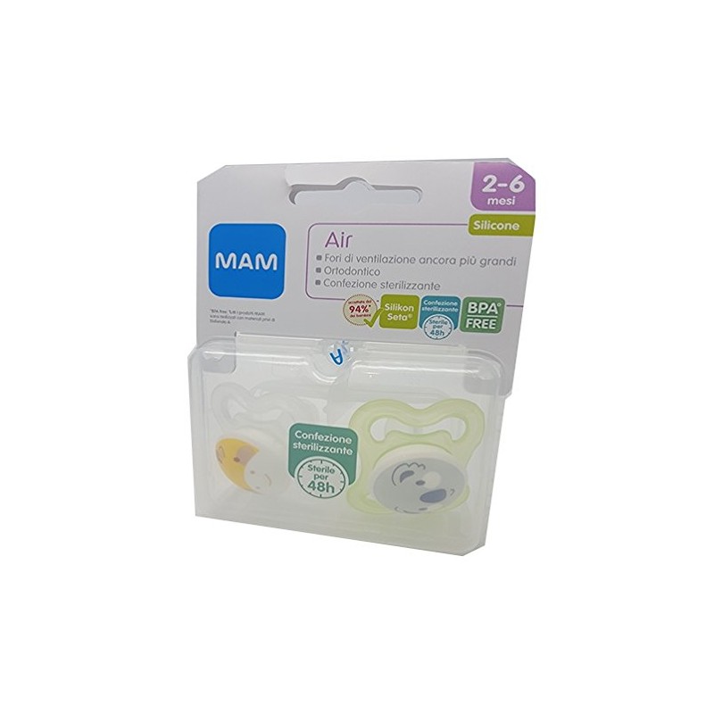 Ciuccio Mam Air dal design extra sottile permette alla pelle del bambino un contatto totale con l aria SilikonSeta Il SilikonSeta della tettarella brevettata MAM è il silicone che fa la differenza morbido e vellutato come la seta Facile da usare Il bottone frontale è facile da afferrare e mai d intralcio Design funzionale Adattabile alla bocca di ogni bambino ortodontico e anatomico grazie alla tettarella MAM che assicura un corretto sviluppo della mascella e dei primi dentini Contenuto confezione 2 succhietti Air 2 6 mesi con tettarella in SilikonSeta 1 confezione sterilizzante MAM COLORI ASSORTIT