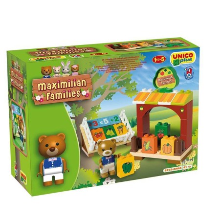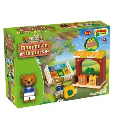 contiene 1 personaggio mattoncini decorati con frutta verdure e soldi e accessori
