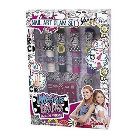 Maggie Bianca set decora unghie glam 4 smalti 3 in 1 anello pennino pennello smalto 2 barattolini di polvere glitterata 40 sticker per unghie e libretto nail art Maggie Bianca Fashion Friends serie Tv