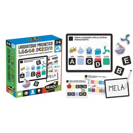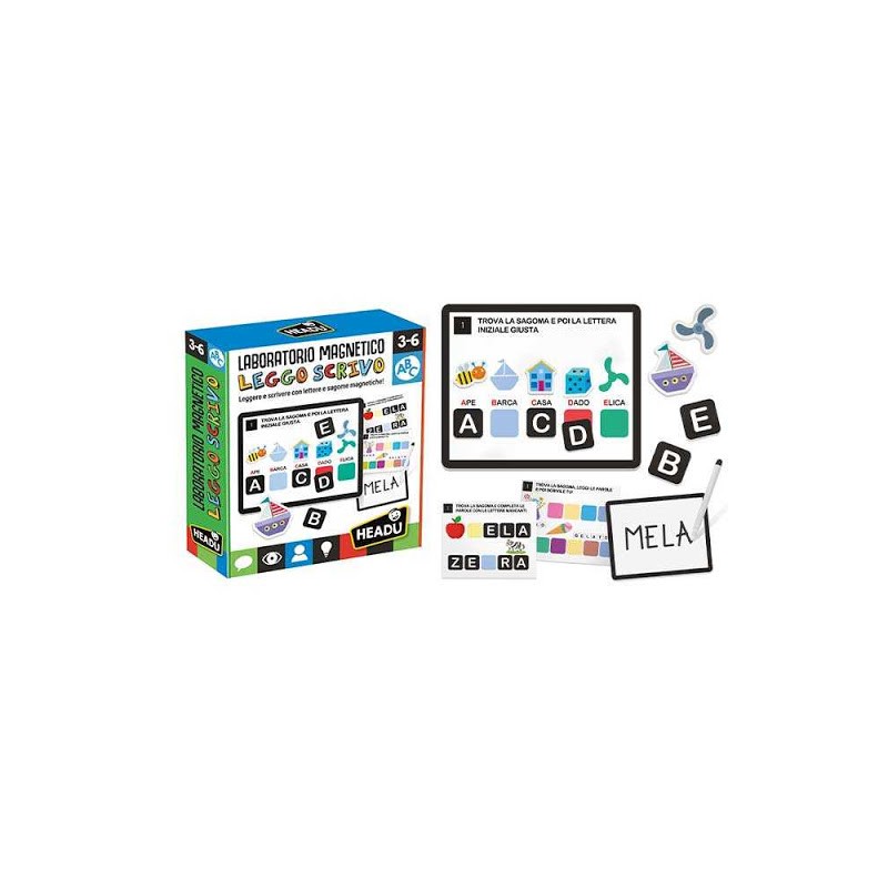 Età 3 6 Leggere e scrivere con lettere e sagome magnetiche Con questo gioco i bambini imparano a riconoscere le lettere dell alfabeto ed a leggere e scrivere le prime parole Nella guida tanti esercizi suggeriti da realizzare con i magnetini le letterine e i soggetti sagomati Riconoscere le lettere dell alfabeto Imparare a scrivere Leggere le parole Ampliare il lessico Sviluppare la manualità 44 Letterine 26 Sagome 1 Lavagna magnetica 70 dischetti magnetici 1 Pennarello scrivi e cancella 1 Quaderno operativo Istruzioni Made in Italy