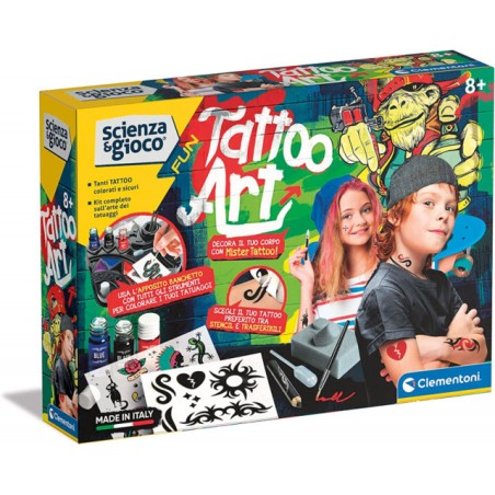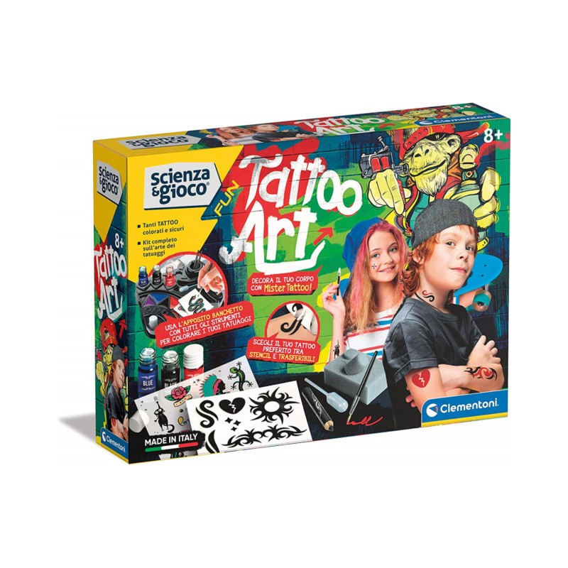Un laboratorio di tatuaggi ma anche un incredibile set con tutto il necessario per realizzare tatuaggi alla moda e da vero duro in perfetto URBAN STYLE Contiene un banchetto da lavoro pennelli coloranti cosmetici liquidi matita nera per disegnare sulla pelle la sagoma del tribale preferito spugnetta e stencil per realizzare tatuaggi a mano libera proprio come un vero tatuatore Il manuale illustrato spiega passo passo come realizzare i tatuaggi guidando il bambino in un esperienza di gioco divertente e coinvolgente E per tatuaggi super resistenti anche alcuni coloratissimi trasferibili Tutte le sostanze e i materiali inclusi in questo kit creativo sono stati testati per garantire la massima sicurezza sulla pelle I tatuaggi temporanei Clementoni sono facilmente removibili con acqua Un gioco scientifico Scienza e Gioco Fun per realizzare tatuaggi per bambini perfetto per stimolare la creatività e la manualità Il regalo ideale per bambini a partire dagli 8 anni Made in Italy
