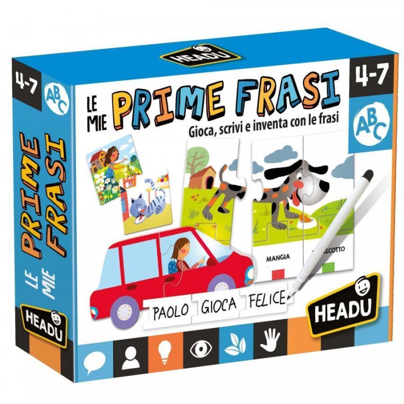 Età 4 6 Gioca scrivi e inventa con le frasi Un gioco per esercitare le capacità di lettura e scrittura attraverso la costruzione delle prime frasi di senso compiuto Un kit ricco che offre più modalità di gioco Prima lettura e prima scrittura Scrivere le prime frasi Pronunciare le parole Manualità fine 6 cartelle delle prime frasi 6 schedine ispirazione 1 auto dei pensierini 1 auto dei superpensierini Tasselli forma frasi Regolamento di gioco Made in Italy