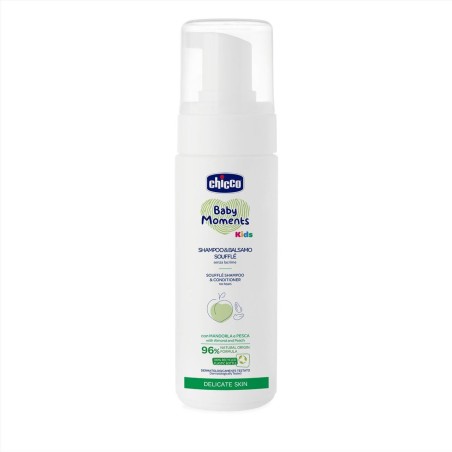 Formulato con il 96 di ingredienti di origine naturale Chicco Shampoo Balsamo Soufflè avvolge i capelli in una mousse morbida e profumata