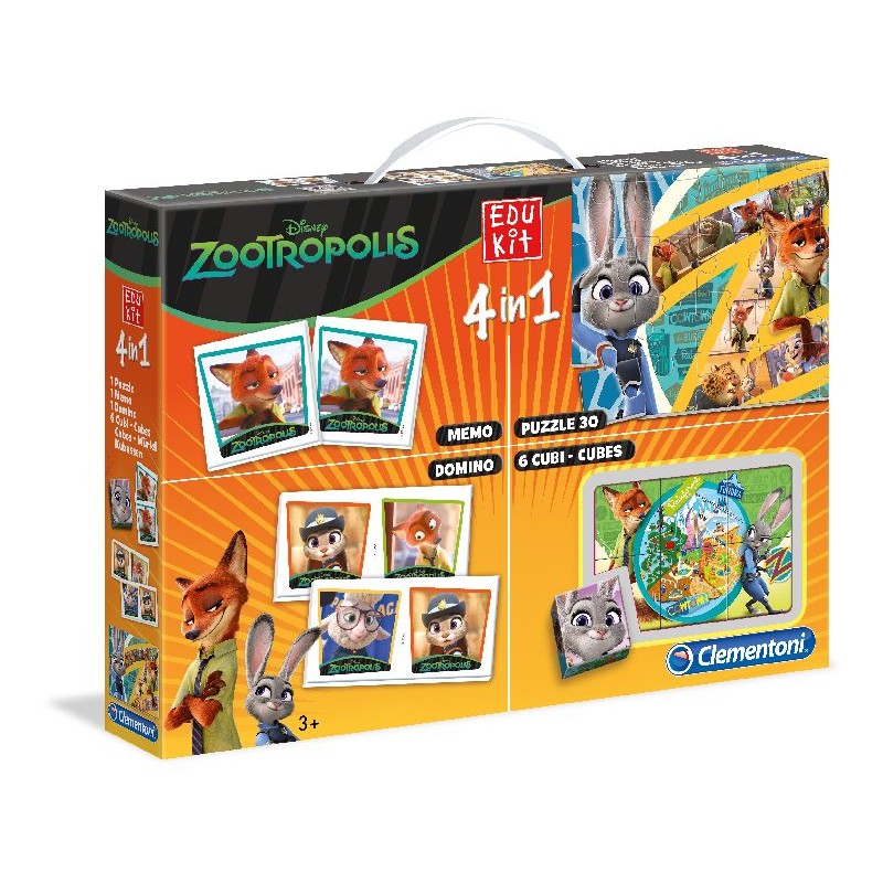 Contiene un memo un domino un puzzle da 35 pezzi e 6 cubi con le immagini dei simpaticissimi protagonisti di Zootopia Sviluppa la memoria la manualità e la capacità di osservazione