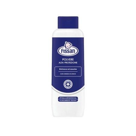 Polvere arricchita con ossido di zinco consigliata per proteggere e prevenire arrossamenti e irritazioni causati dallo sfregamento con il pannolino o da altri fattori esterni quale per esempio la sudorazione Grazie al talco puro presente nella sua formula la polvere di Fissan alta protezione favorisce una normale traspirazione ed esercita sulla pelle umida o sudata una delicata azione assorbente e rinfrescante lasciandola morbida e asciutta Formula testata in dermatologia pediatrica Formula ipoallergenica Ridotto rischio di inalazione grazie alla bassa volatilità della formula Senza conservanti Formato Disponibile nei formati 100 250 e 500 g Cod 51680 51683 51684