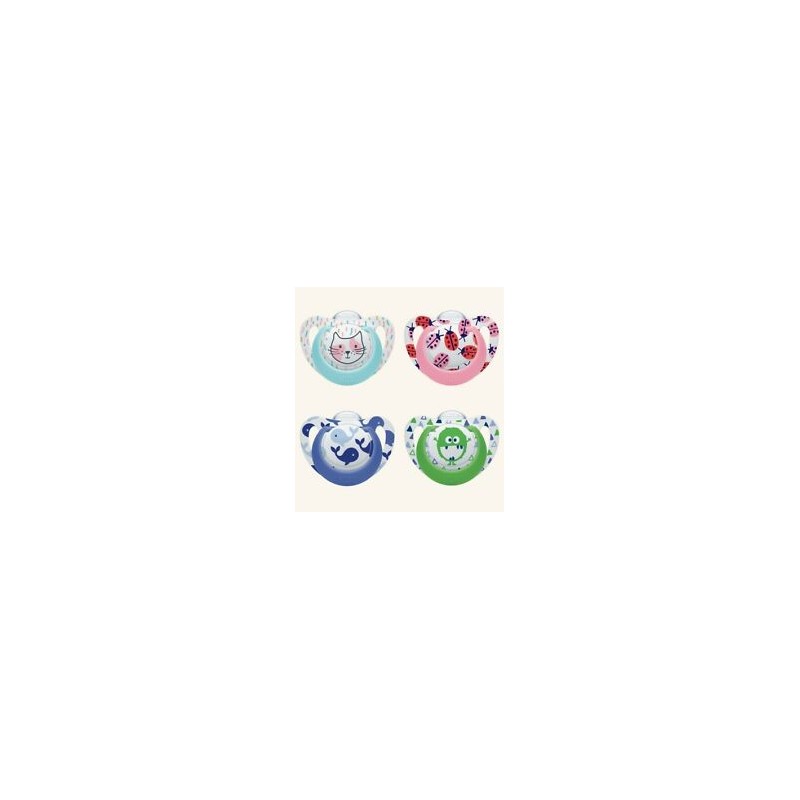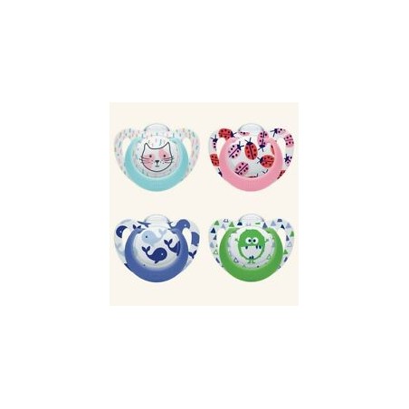 I succhietti NUK Classic Assortiti in silicone hanno la forma ortodontica NUK lo scudo di forma anatomica e motivi adatti al mondo colorato dei bambini