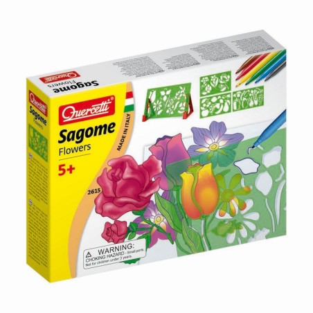 Include 4 sagome con i disegni di fiori frutta e ortaggi 6 pennarelli 1 album per disegnare 2 piedini porta sagome