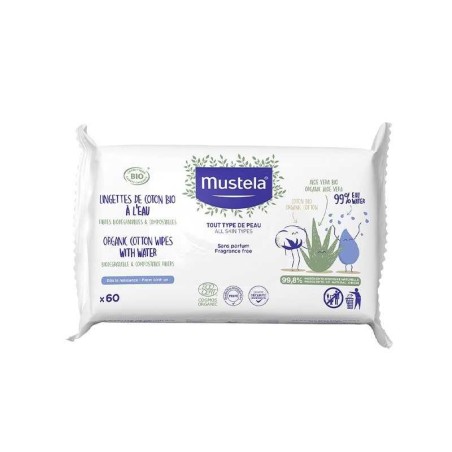 Mustela Salviette BIO 60pz Salviette all Acqua in Cotone 99 Ingredienti Naturali detergono delicatamente la pelle di tutta la famiglia sin dalla Nascita Comode da portarsi a passeggio