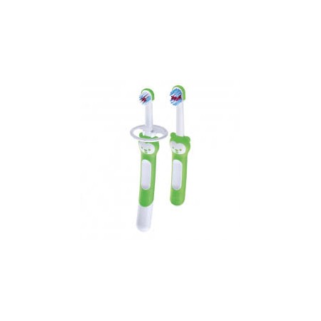 Confezione mam learn to brush set set spazzolini da denti 5 mesi 2 spazzolini 1 anello di protezione per la gola senza bpa e bps istruzioni in italiano verde articolo numero 9001616706899