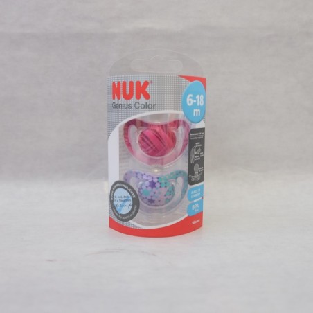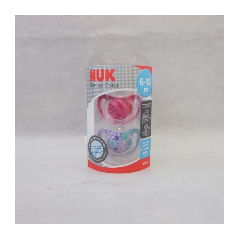 Il succhietto Genius in silicone misure 1 e 2 di Nuk ha una speciale forma ortodontica e asimmetrica disegnata dai dentisti sul modello del seno materno Questo specifico modello è stato sviluppato