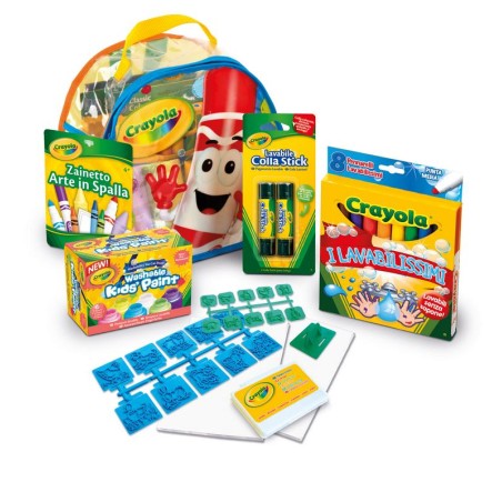 Simpatico zainetto da portare sempre con sé completo di maniglia e bretelle che comprende un ricco e vario assortimento di prodotti creativi Crayola come pennarelli tempere stampini per accompagnare