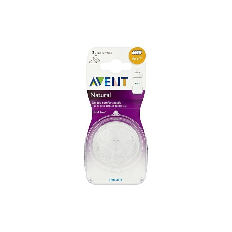 AVENT Natural Tettarella a flusso rapido con 4 fori Dai 6 mesi Allattamento naturale grazie all ampia tettarella dalla forma anatomica Esclusivi petali per il massimo comfort e una tettarella morbida e flessibile Sistema anti colica avanzato con il sistema a doppia valvola Tettarella senza BPA bisfenolo A Formato 2 pezzi Cod SCF65427