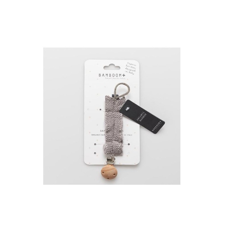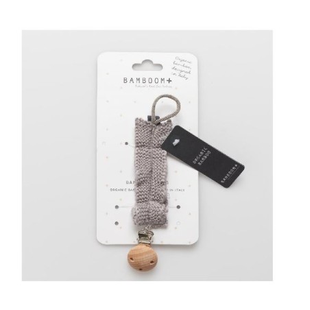 Un elegante portaciuccio realizzato in stoffa arricciata lavorata a maglia in 100 bambù organico e dotato di una clip in legno per appenderlo alla vestitino del bebè