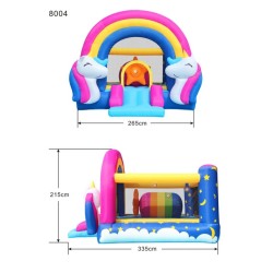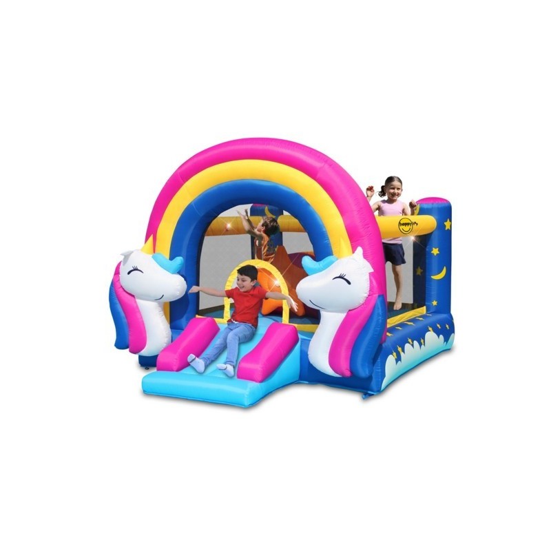 Fantasy Unicorn è il modello più colorato di mini gonfiabili della linea interattiva HITME di Happy HOP dotato di salterello scivolo e una stella gigante che insieme all arcobaleno farà sognare tutti i bambini che amano il magico mondo degli unicorni e che amano anche muoversi schiacciando i vari pulsanti che cambiano colore continuamente Dotato di 8 pulsanti che si possono inserire negli appositi spazi distribuiti sul gonfiabile EAN 6933491980046