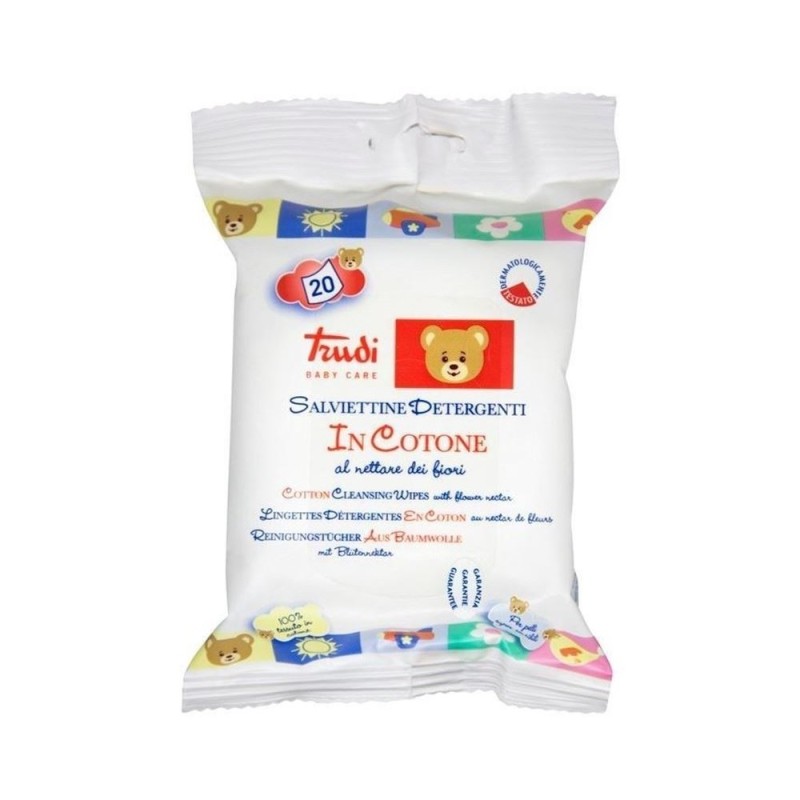 Le Salviettine umidificate Trudi Baby Care grazie al loro particolare tessuto in microspugna a nido d ape accarezzano morbidamente il sederino del bebè ad ogni cambio pannolino Ad ogni utilizzo lasciano sulla pelle uno strato di leggera emulsione fluida a base di nettare dei fiori noto per sue proprietà nutrienti