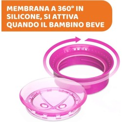 MEMBRANA IN SILICONE La membrana in silicone si attiva solo quando il bambino beve per ridurre la fuoriuscita del liquido la sua superficie trasparente permette al bambino di vedere arrivare il liquido per essere pronto a riceverlo in bocca