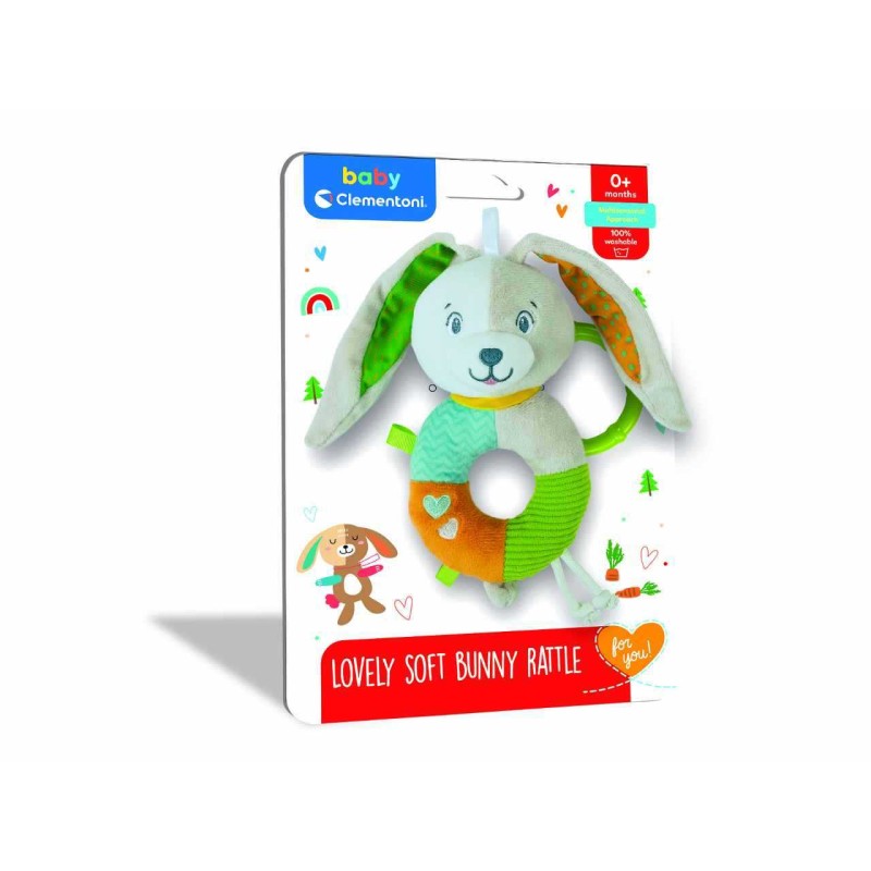 Un morbido coniglietto sonaglino tutto da coccolare Facile da impugnare il coniglietto e ideale per stimolare e intrattenere i piu piccoli Con diversi tessuti e colori vivaci supporta lo sviluppo della percezione visiva uditiva e la manualita Il pratico anello puo essere agganciato in piu punti per appendere il coniglietto ovunque e portarlo sempre con se