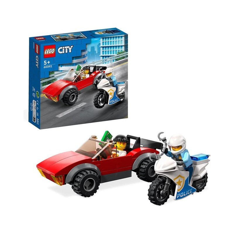 Questo set LEGO City per bambini dai 5 anni in su include una moto giocattolo della polizia e un modellino di auto sportiva rossa oltre alle minifigure dell agente e del criminale