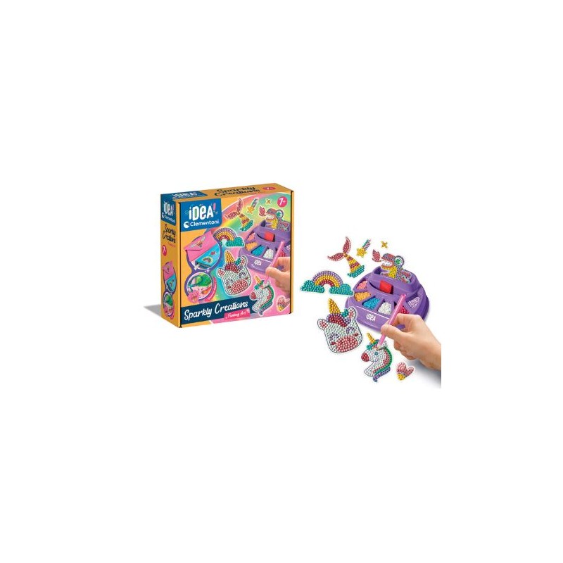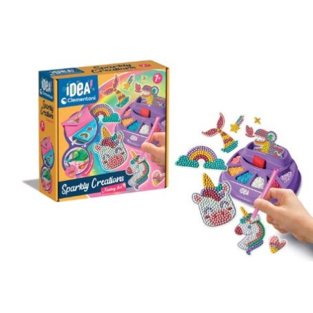 Idea sparkly creations fantasy art un nuovo gioco basato sull attività dei diamantini per realizzare creazioni brillanti e colorate Grazie alla guida colore e all apposita penna è possibile applicare facilmente le gemme 3d su stickers dal design originale e divertente In questa versione le illustrazioni sono a tema fantasy con simpaticissimi unicorni grazie al pratico porta accessori è possibile mantenere tutti i componenti in ordine Ideato e progetto in italia ù