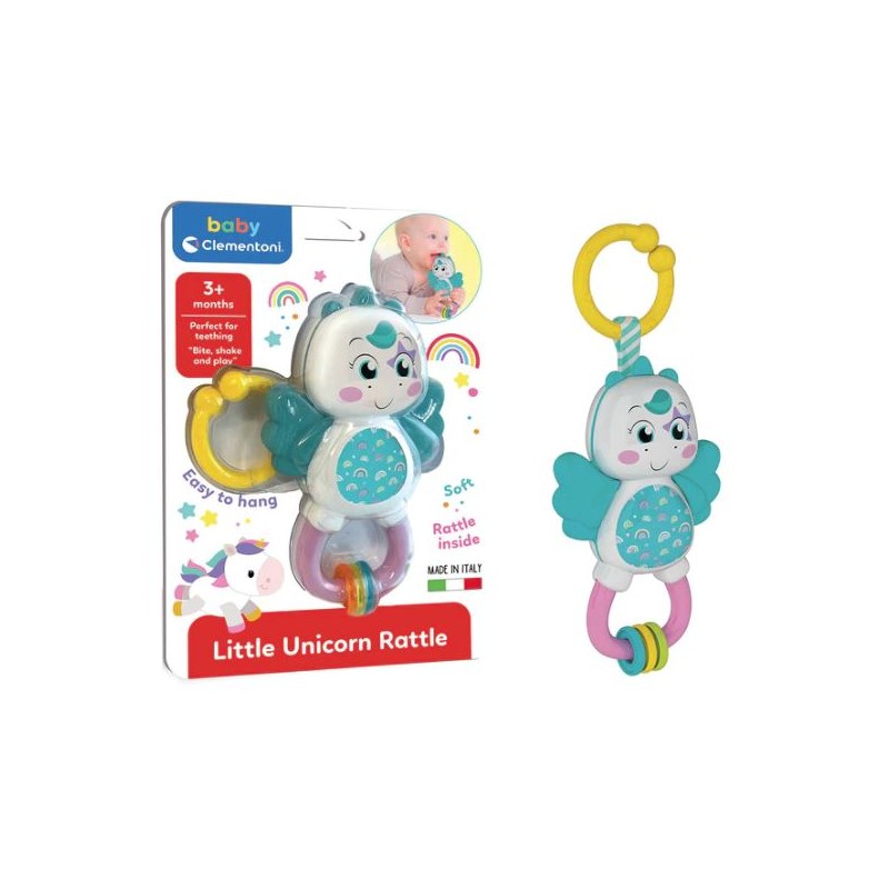 Rattle unicorn made in italy un simpatico sonaglino a forma di unicorno con colorate parti in gomma morbida e sicura per favorire la dentizione i suoni del sonaglino e i suoi colori sono perfetti per promuovere lo sviluppo multisensoriale del bambino dotato di un comodo anello per appenderlo e di tre anellini mobili Stimola la manualità e la percezione uditiva Made in italy