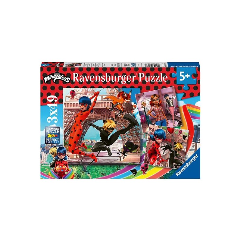 Questo puzzle raffigura gli iconici personaggi di Miraculous in 3 scene diverse ed è adatto ai bambini dai 5 anni in su ù