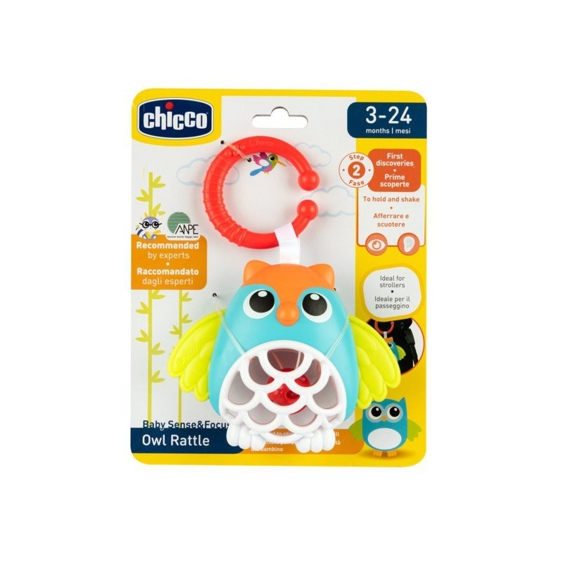 Trillino a forma di gufo con la pancia in plastica morbida contenente una pallina che crea un simpatico movimento quando si scuote il giocattolo