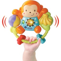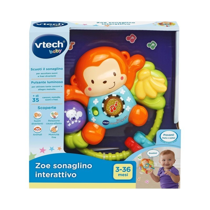 Grazie al sensore di movimento il sonaglino emette suoni e frasi divertenti Il pulsante luminoso attiva frasi canzoni e melodie per divertire il bambino Sviluppa la motricità fine grazie ai tanti