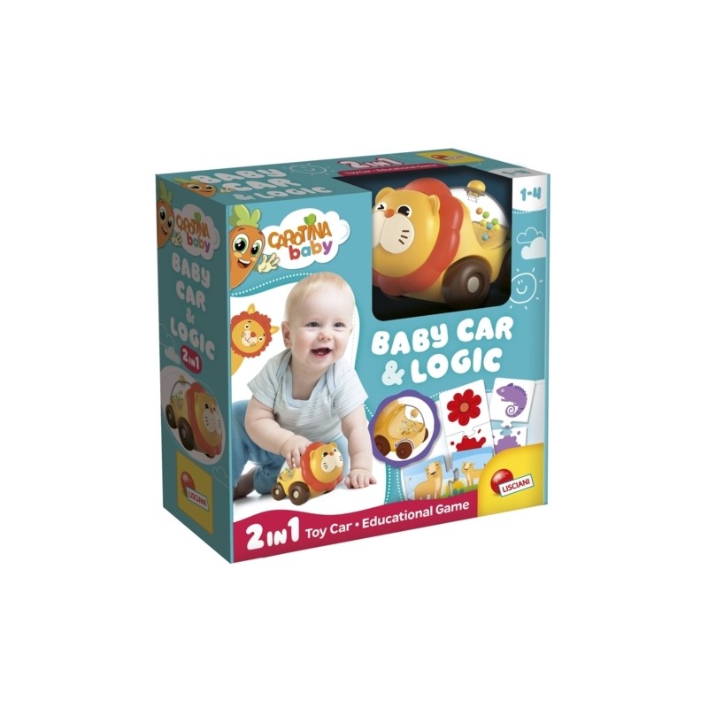 Un simpatico leone macchinina con un gioco educativo per sviluppare il pensiero logico