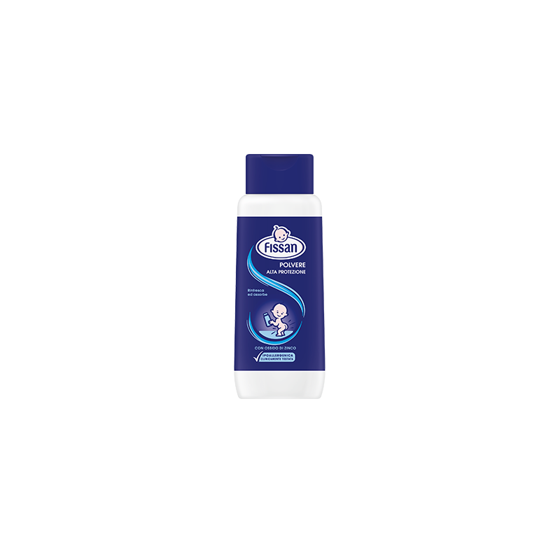 La POLVERE DI FISSAN ALTA PROTEZIONE arricchita con Ossido di Zinco è consigliata per proteggere e prevenire arrossamenti e irritazioni causati dallo sfregamento con il pannolino o da altri fattori esterni quali ad esempio la sudorazione Grazie al Talco puro presente nella sua formula la Polvere di Fissan Alta Protezione favorisce una normale traspirazione ed esercita sulla pelle umida o sudata una delicata azione assorbente e rinfrescante lasciandola morbida e asciutta