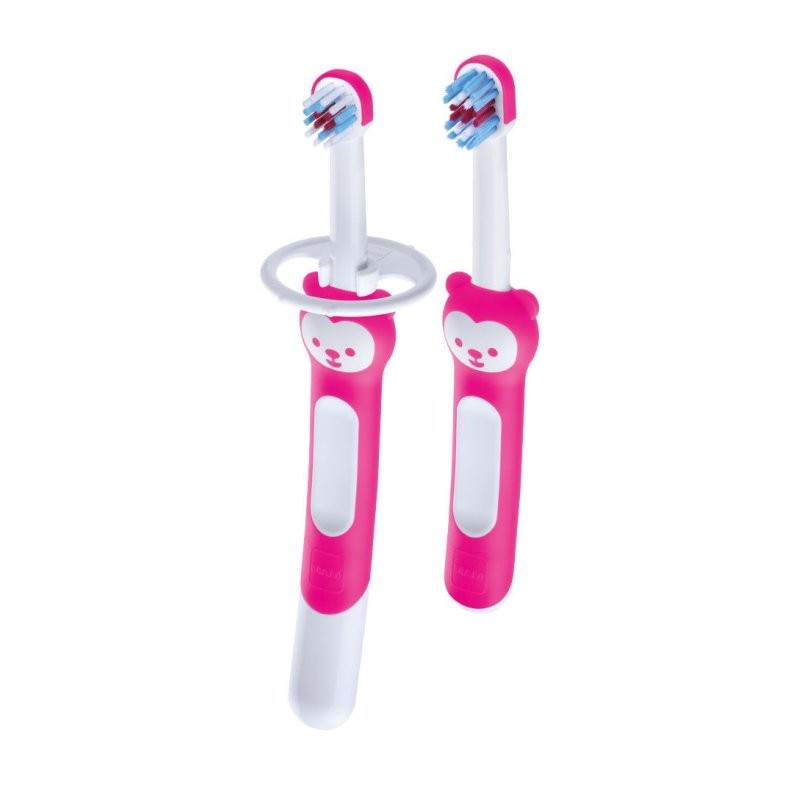 MAM Training Brush lo spazzolino con il manico extra lungo consente ai genitori di supportare i bambini durante la prima fase insegnando loro i movimenti e le tecniche da attuare MAM Baby s Brush dispone di un manico corto e compatto ideale per i primi tentativi autonomi dei bimbi Le setole extra morbide puliscono i denti delicatamente mentre la testa arrotondata dello spazzolino è ideale per la piccola bocca dei bimbi