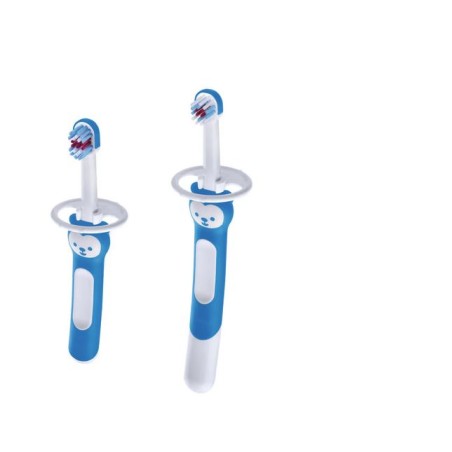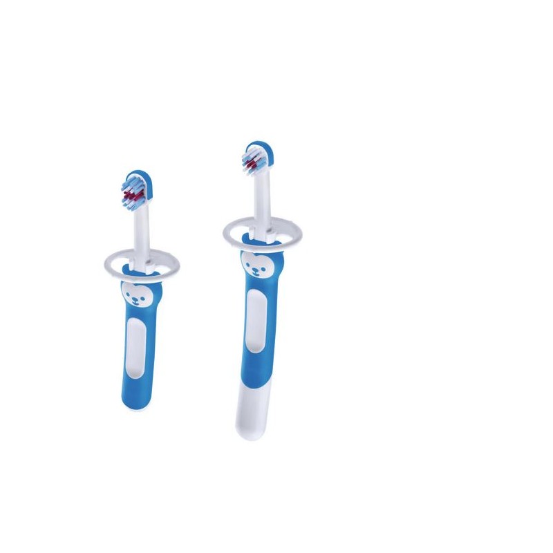 MAM Training Brush lo spazzolino con il manico extra lungo consente ai genitori di supportare i bambini durante la prima fase insegnando loro i movimenti e le tecniche da attuare MAM Baby s Brush dispone di un manico corto e compatto ideale per i primi tentativi autonomi dei bimbi Le setole extra morbide puliscono i denti delicatamente mentre la testa arrotondata dello spazzolino è ideale per la piccola bocca dei bimbi