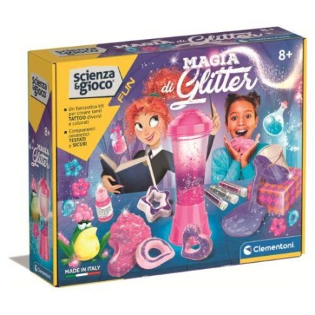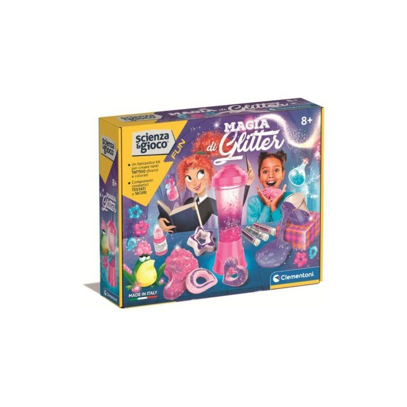 Magia di Glitter un esplosione di glitter magica per divertirsi con la scienza in modo facile e originale aiutando la maga Glitterina a combattere il perfido stregone Oscurus Il gioco contiene tutti i materiali e gli strumenti necessari per realizzare tanti esperimenti e creazioni originali come la glitter lamp gessetti decorativi da appendere e slime luccicanti Tra le creazioni possibili anche una pasta modellabile colorata e glitterata e barattolino della calma davvero magici Il manuale strutturato come un libricino guida i bambini nella realizzazione degli esperimenti coinvolgendoli con la storia della maga Glitterina e dello stregone Oscurus Tutte le sostanze e i componenti utilizzati nel gioco sono testati e certificati per garantire un esperienza di gioco completamente sicura