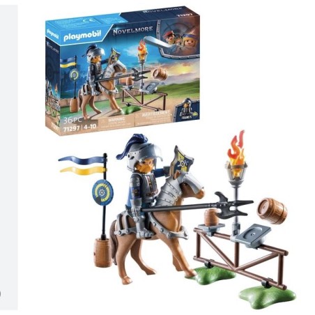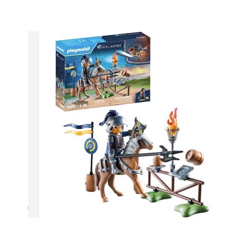 Con molta ambizione il cavaliere di Novelmore Francis Forthwind si prepara per il Grande Torneo del Guardiano Si allena diligentemente con il suo cavallo e la lancia sul campo di allenamento Con la sua lancia tesa cavalca verso la recinzione e spinge abilmente verso il basso la canna Dopo tanto allenamento Francesco sarà difficile da battere Con funzioni di gioco e difesa creative una storia mistica e personaggi emozionanti il grande mondo cavalleresco di PLAYMOBIL Novelmore fornisce molto materiale per storie eroiche ricche di azione
