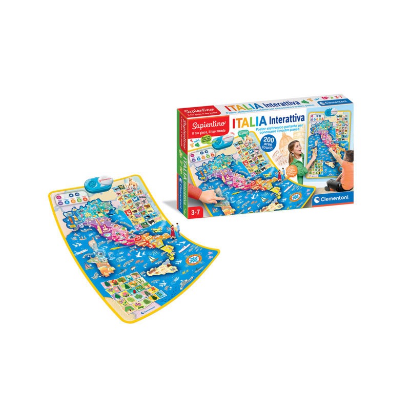 Una Mappa dell Italia parlante e interattiva con tante informazioni sull Italia fisica e politica sui monumenti le curiosità e le tipicità regionali gli animali la musica e tanto altro ancora Con 200 punti di contatto e 5 modalità di gioco la mappa accompagnerà il bambino alla scoperta della geografia italiana il poster interattivo misura 70 x 48cm ha volume regolabile e spegnimento automatico 5 modalità di gioco Nomi di città e regioni Musica Curiosità Animali Quiz sull Italia Il gioco perfetto per i bambini che stanno imparando la geografia italiana