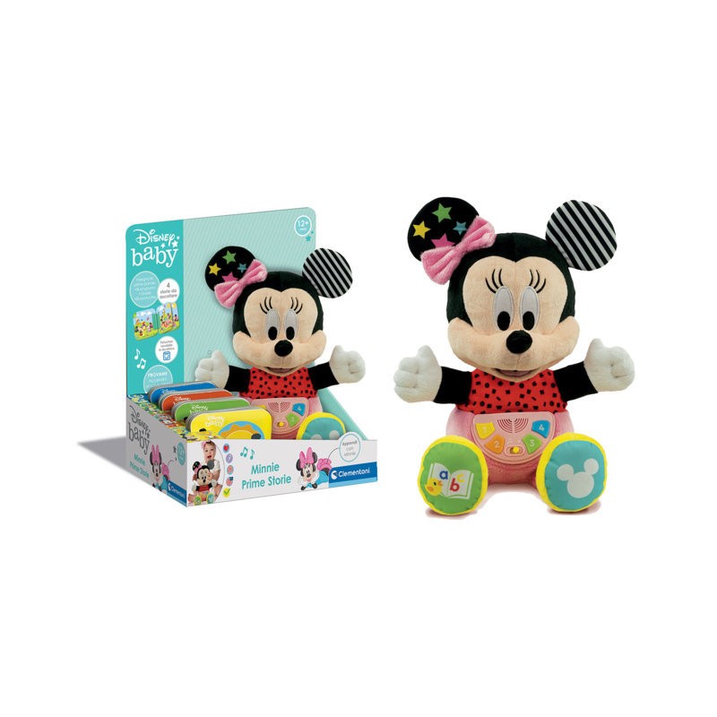Baby Minnie diventa un amica inseparabile Il morbido peluche raccontastorie accompagnerà il bambino in ogni momento I quattro libricini inclusi descrivono ognuno un momento diverso della giornata Premendo i pulsanti sulla pancia del peluche i bambino potrà ascoltare le storie seguendo la narrazione attraverso le semplici illustrazioni presenti sui libricini La tenera Minnie renderà il bambino molto più coinvolto durante l attività dell ascolto stimolando empatia e concentrazione Il modulo elettronico sfoderabile rende il plush perfettamente lavabile in lavatrice