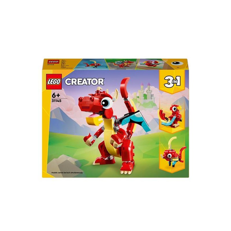 I bambini e le bambine creative dai 6 anni in su fan degli animali giocattolo da costruire possono scoprire una terra magica per vivere storie divertenti con il set di giochi 3 in 1 LEGO Creator Drago Rosso 31145 Il set contiene un simpatico drago giocattolo rosso dotato di grandi occhi con braccia mani ali gambe zampe testa e bocca snodabili I bambini possono mettere in qualsiasi posa il drago LEGO per esporlo nella lora camera da letto oppure usarlo come preferiscono per le loro avventure e giochi creativi Questo set LEGO Creator offre ai piccoli un mondo di possibilità di gioco i bambini possono infatti costruire 3 diversi animali LEGO utilizzando gli stessi mattoncini possono realizzare l action figure del drago snodabile ricostruirlo in un modello di fenice giocattolo con piume colorate trasformarlo in un pesce con pinne mobili oppure creare il proprio animale giocattolo preferito I giocattoli LEGO Creator 3 in 1 sono ottimi regali per i bambini con 3 diversi modelli da creare in ogni scatola I piccoli saranno entusiasti di costruire e ricostruire questi modelli i set 3 in 1 offrono ore di intrattenimento attraverso una gamma di costruzioni che soddisfano le loro più grandi passioni tra cui veicoli superveloci divertenti animali e scene urbane dettagliate