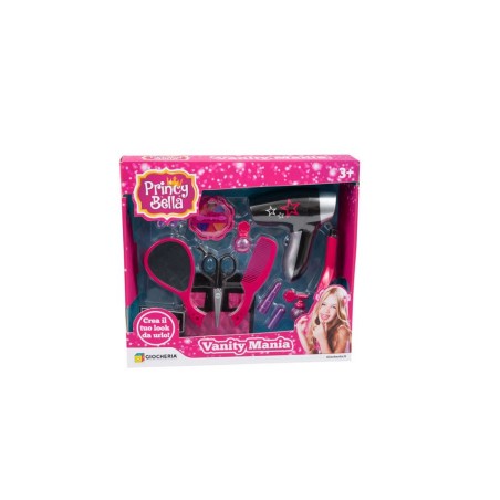 Vanity Mania Princy Bella Set Beauty Capelli Set Vanity comprensivo di phon a batterie ferro per capelli forbici specchio make up forcine e altri accessori per giocare coem in un salone di bellezza