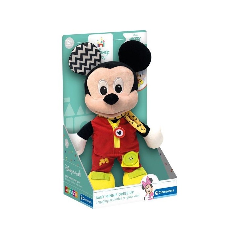 Il simpatico peluche di Baby Mickey con tante dinamiche di gioco legate alla quotidianità del bambino per sperimentare ed esercitare le abilità manuali per imparare a fare da solo nell azione del vestirsi Ispirato al metodo Montessori offre al bambino tante attività per esercitare la manualità cerniera bottone da inserire nell asola lacci in velcro da aprire e chiudere e accessori da mettere e togliere Il peluche di Baby Mickey viene proposto con un design ricercato colorato con diversi materiali e funzioni per stimolare la sensorialità Baby Mickey è un personaggio riconoscibile e amato dai più piccoli stimola l empatia e l attitudine del prendersi cura diventando un compagno di giochi inseparabile per ogni bambino Lavabile in lavatrice