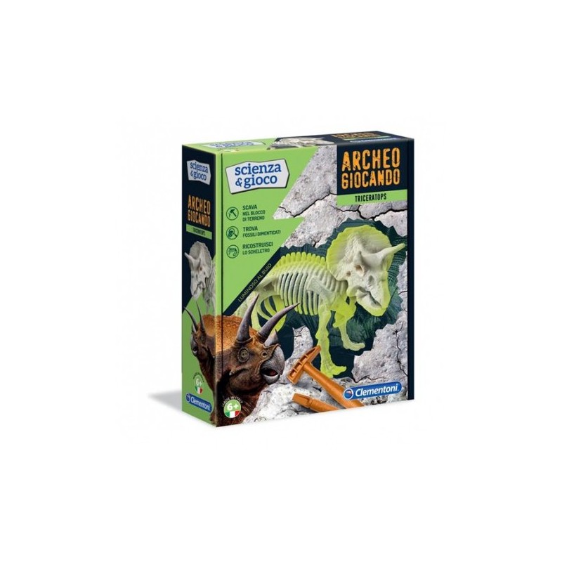 Sorprendi la tua curiosità scava e assembla i resti del leggendario Triceratono e guardalo illuminarsi al buio Rivivi il passato grazie alla realtà aumentata Con l app gratuita basta inquadrare le carte del gioco per far rivivere la creatura Divertiti a scattare foto e a personalizzarle gira tanti video e condividili La confezione contiene martello e scalpello per diventare un vero paleontologo