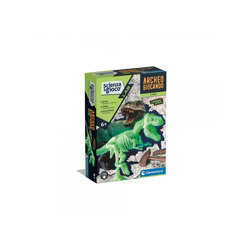 Scava il mattone e scopri lo scheletro fosforescente del leggendario T Rex Rivivi il passato grazie alla realtà aumentata Con l app gratuita basta inquadrare le carte del gioco per far rivivere la creatura Divertiti a scattare foto e a personalizzarle gira tanti video e condividili La confezione contiene martello e scalpello per diventare un vero paleontologo