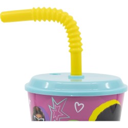 Comodo bicchiere realizzato in materiale resistente e decorato con alcuni dei principali protagonisti del mondo del cinema e della televisione per bambini Grazie al coperchio e alla cannuccia i bambini potranno bere comodamente e in sicurezza evitando schizzi e fuoriuscite accidentali Coperchio e cannuccia flessibili incorporati Senza BPA Capacità 430 ml Licenze ufficiali