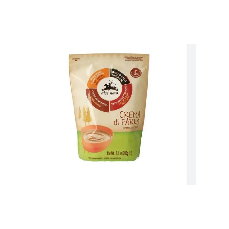 La crema di farro bio Alce Nero è preparata con farro 100 biologico coltivato in Italia e con l aggiunta di vitamina B1 come da normativa vigente Non contiene aromi è istantanea ed è indicata a partire dal 6 mese in poi