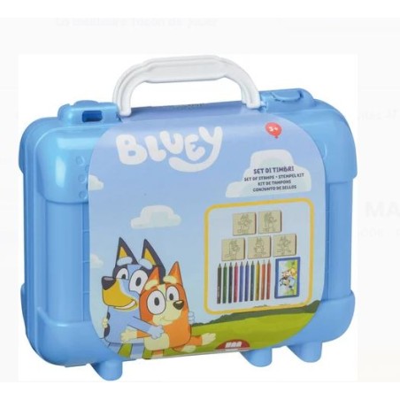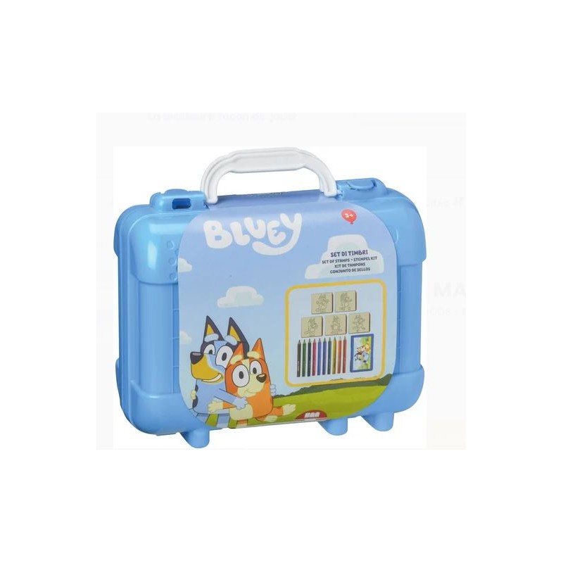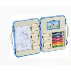 Kit da viaggio Set 5 Bluey pads Contiene 5 pastiglie in legno e lattice naturale 10 matite colorate 1 tampone con inchiostro lavabile e non tossico 1 libretto da colorare 2 adesivi puzzle per decorare la valigetta Una valigetta molto utile per portare le sue opere ovunque con se stessi Dimensioni 23 x 10 50 x 19 cm