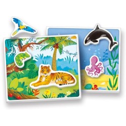 La meccanica di gioco è facile e intuitiva grazie ai tabelloni ambiente con tanti differenti scenari sui quali collocare gli animali sagomati in cartone